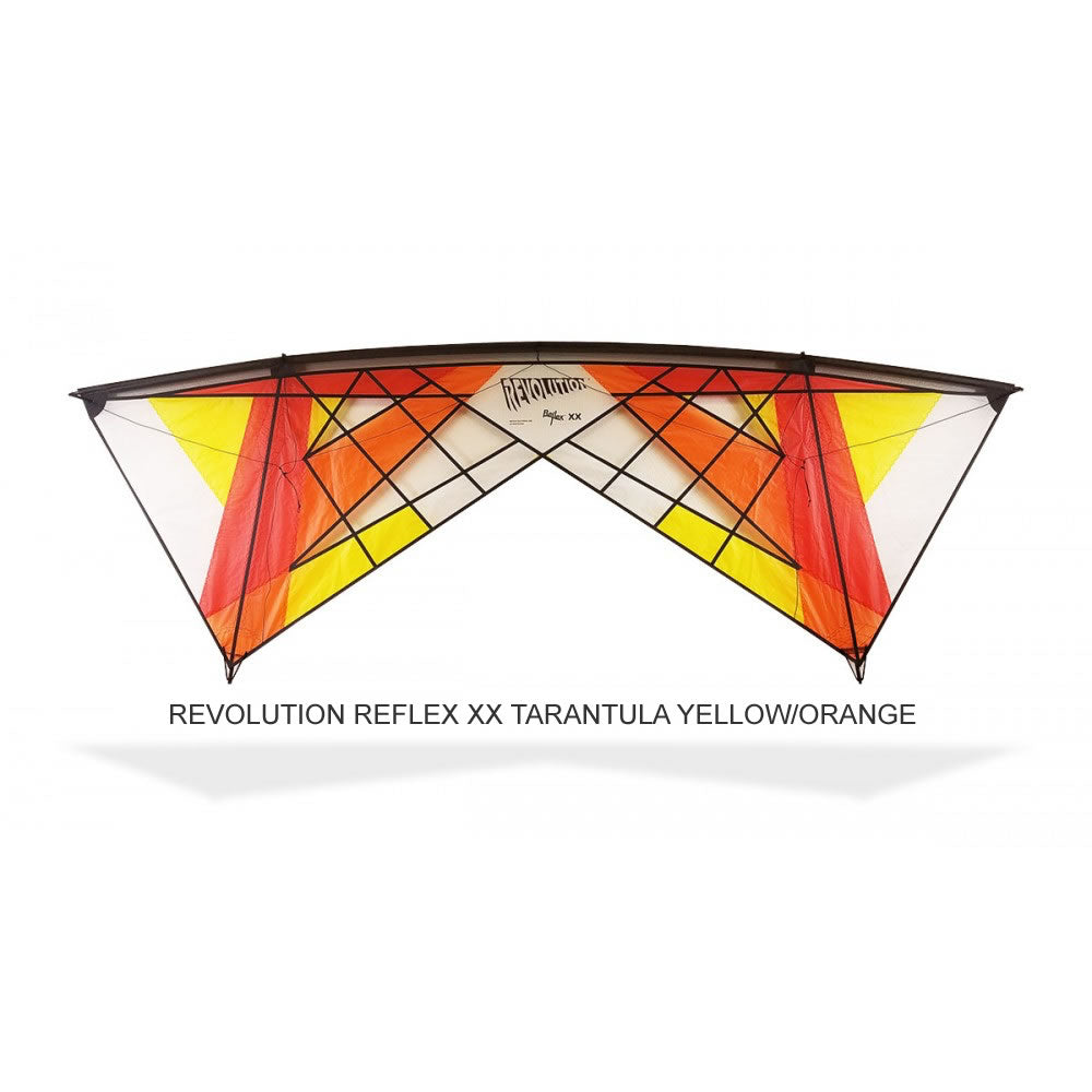 Revolution?s Reflex XX Tarantula is a vented version of the XX. Venting allows for higher wind conditions up to 18 mph, while the 'no screen' venting reduces weight allowing for lighter conditions, down to 3 mph. 'No screen' venting also allows for faster reverse flying, smoother 'Floats' (Club 38 skill 26) and a lighter, more responsive touch!